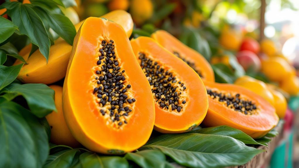 Digestive harmony is one of the remarkable benefits you'll enjoy by including papayas in your diet. This tropical fruit is high in dietary fiber, providing about 2.5 grams per cup, which is vital for promoting regular bowel movements and preventing constipation. By keeping things moving smoothly, you'll maintain peak gut health. Moreover, papaya contains the enzyme papain, which plays a significant role in breaking down proteins. This not only facilitates digestion but also helps reduce bloating and discomfort often associated with heavy meals.