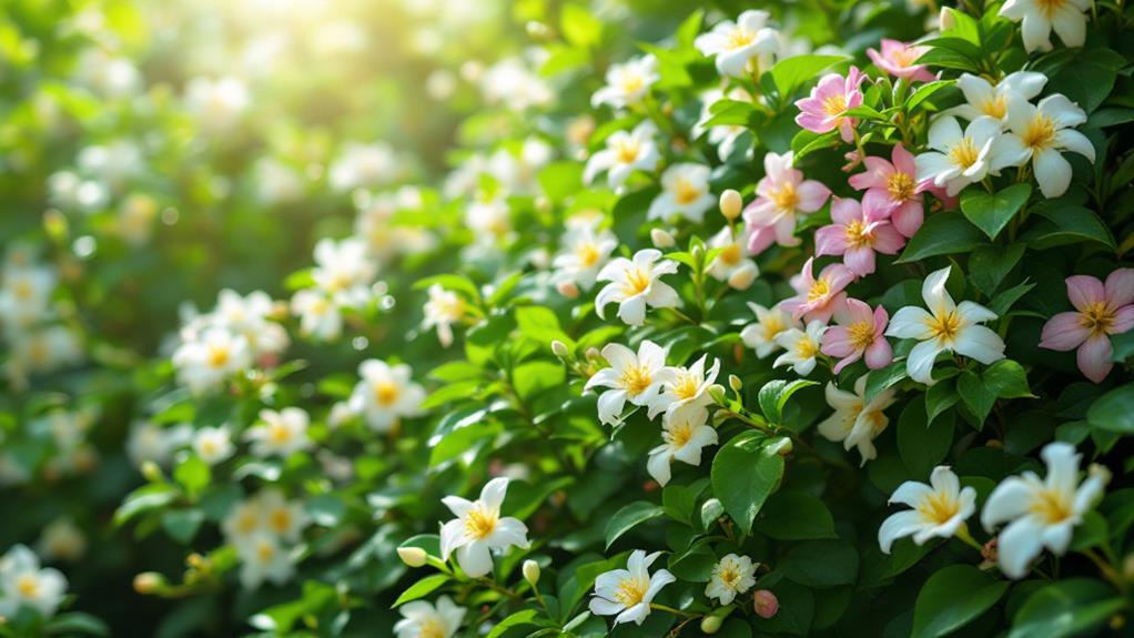 In the domain of exploring jasmine varieties, you're in for a fragrant treat. With over 200 species, jasmine offers a rich tapestry of scents and sights. Common Jasmine, or Jasminum officinale, enchants with its fragrant white flowers, perfect for adding elegance to your garden. Arabian Jasmine, known as Jasminum sambac, is cherished for its small, waxy blooms that are both aromatic and visually appealing.