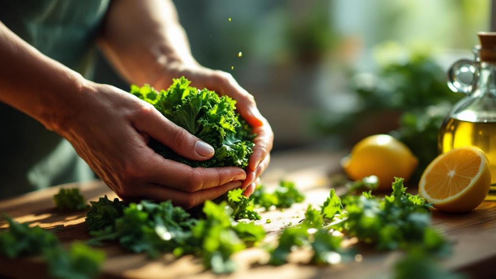 Transform your kale with the right techniques to release its full potential. Start by removing those tough stems and tearing the leaves into manageable 1-2 inch pieces. This makes it easier to massage kale effectively and guarantees even tenderization. Before you begin the massage, add a pinch of salt and a splash of lemon juice or vinegar. These ingredients help break down the kale's fibers, enhancing both flavor and texture.